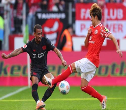 第34分钟,美因茨扳回一球。韩国球星李在城低射打进,缩小差距。随后,科尔犯规被出示黄牌。半场临近结束,格里马尔多在禁区内单刀推射破门,梅开二度。半场结束,勒沃库森3-1领先美因茨。
